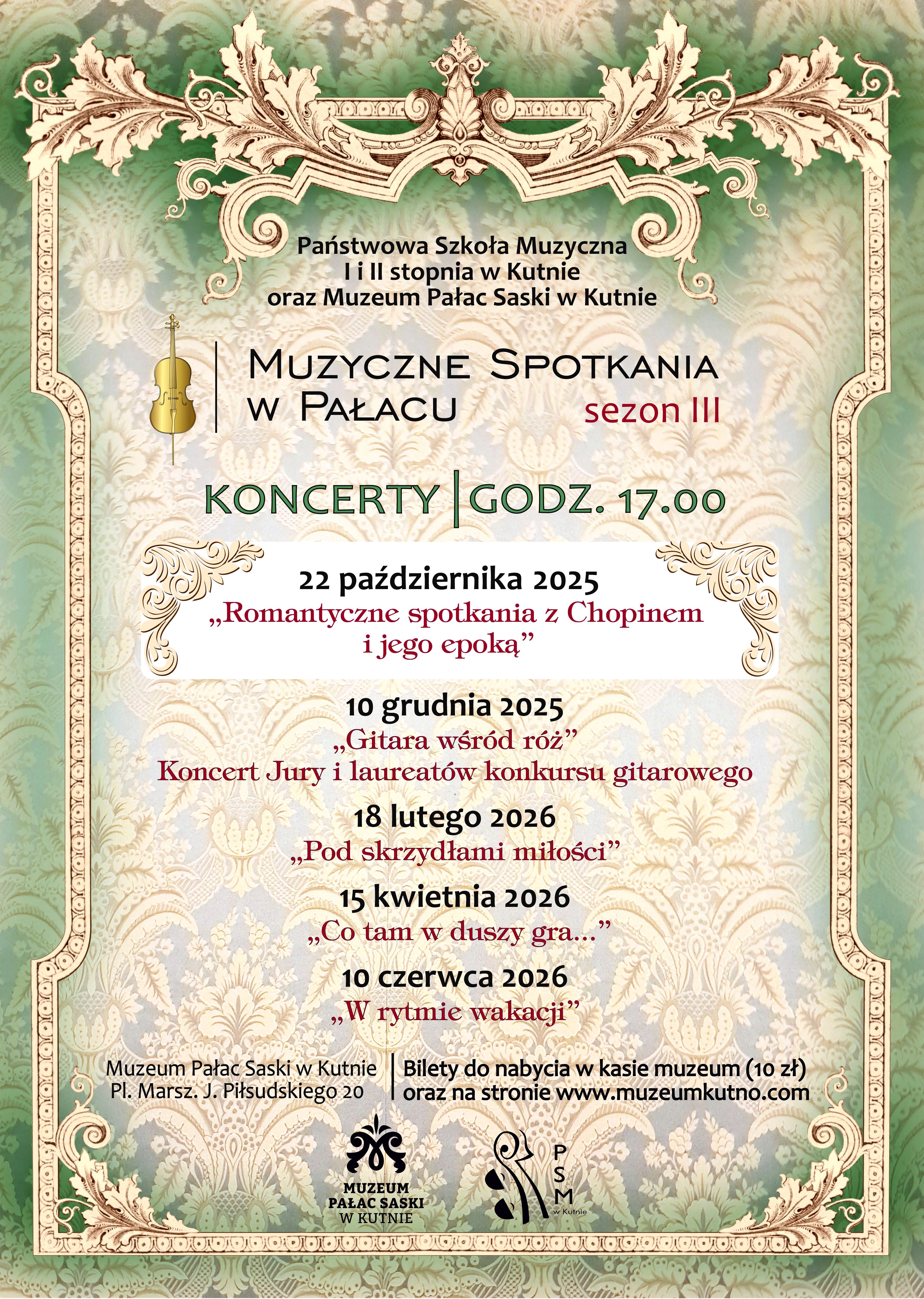 16.10.2025 Muzyczne Spotkania w Pałacu Saskim w Kutnie Do pobrania Załącznik Rozmiar Pobierz jpg plakat wydarzenia 2.32 MB Pobierz UdostępnijDrukujPDF Pozostałe aktualnościArchiwum aktualności